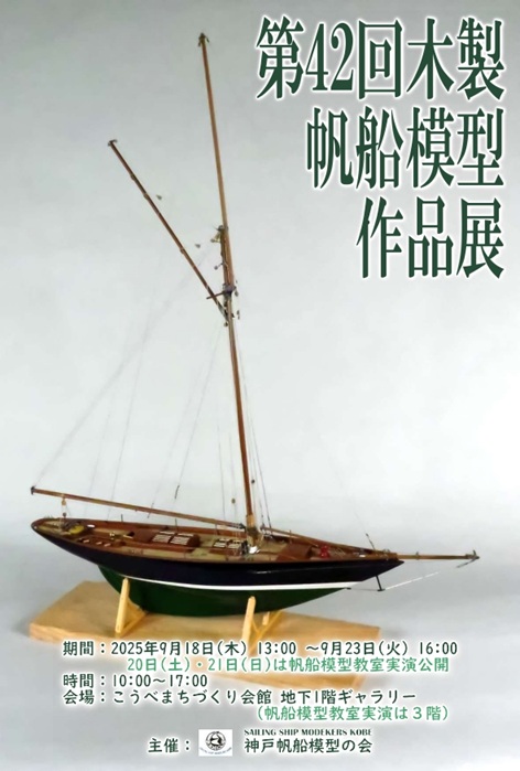 お知らせ 第42回木製帆船模型作品展 神戸帆船模型の会 2025年9月19日 IGA 開催日 :2025年9月18日(木)~23日(火):10時~17時 (18日は13時から17時まで最終日23日は10時から16時まで)会場 :こうべまちづくり会館 地下1階ギャラリー住所 :神戸市中央区元町4−2-14主催 :神戸帆船模型の会入場 :無料 共有:クリックして Twitter で共有 (新しいウィンドウで開きます)Facebook で共有するにはクリックしてください (新しいウィンドウで開きます) 関連